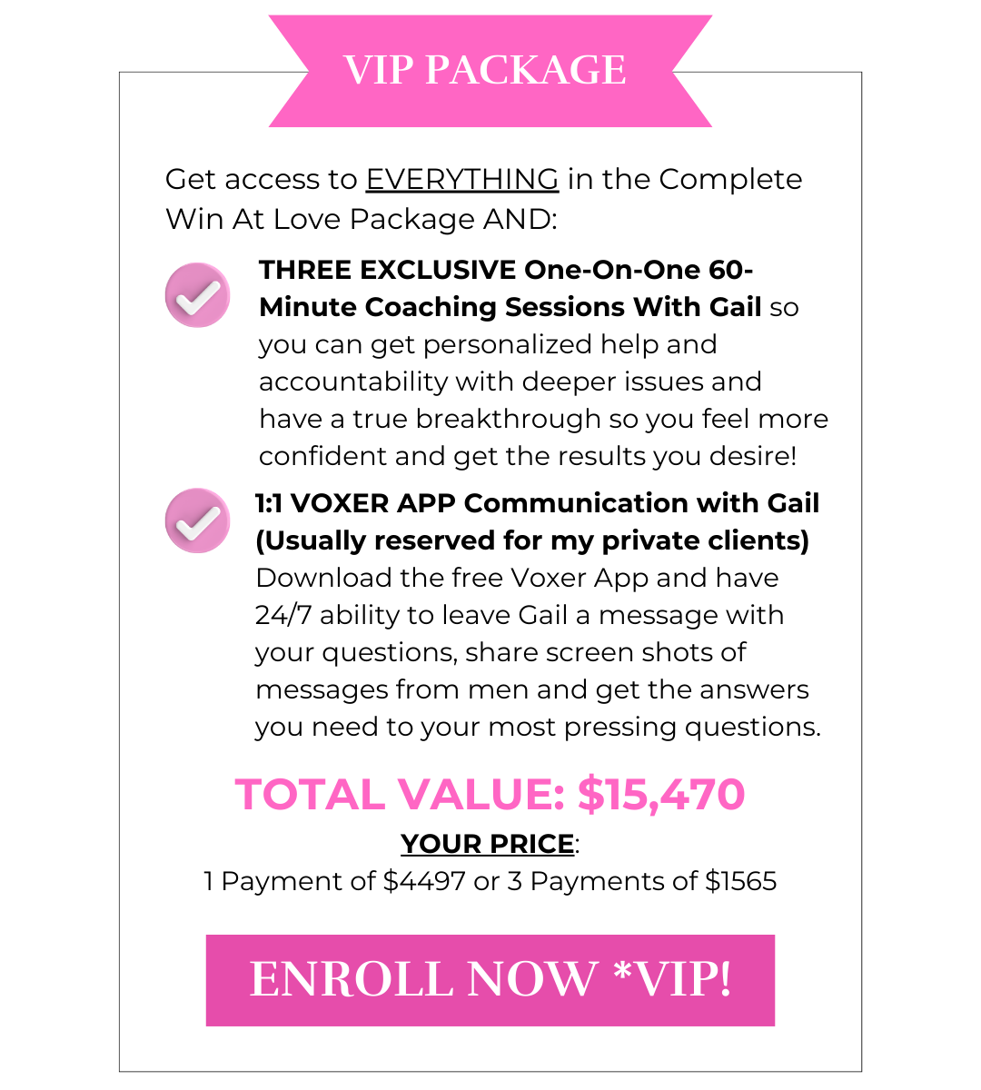 Pay-In-Full Bonus: Get Gail’s Personalized Dating Profile Video Review (including photos) so it’s optimized and attracting YOUR Ideal Man Valued at $997 FREE When You Pay in Full