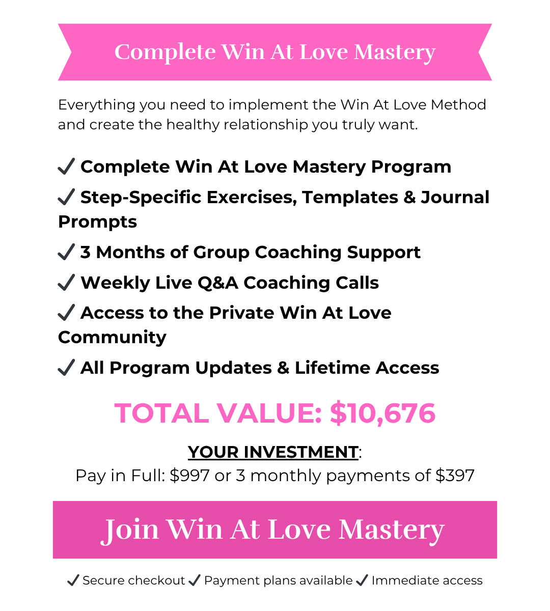 So you can date with confidence, trust your choices, and create the healthy relationship you truly want. Introducing Win At Love Mastery